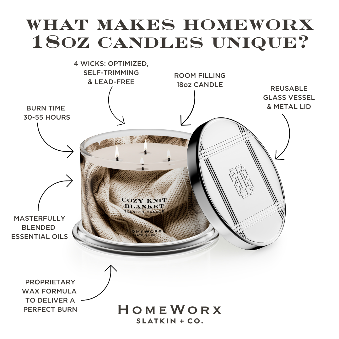 HomeWorx was founded by Harry Slatkin, a talented expert in the industry and deemed the "King of Home Fragrance" by The New York Times. HomeWorx was created to bring a luxury experience into your home. All candles burn clean with lead-free cotton wicks & natural wax blends.